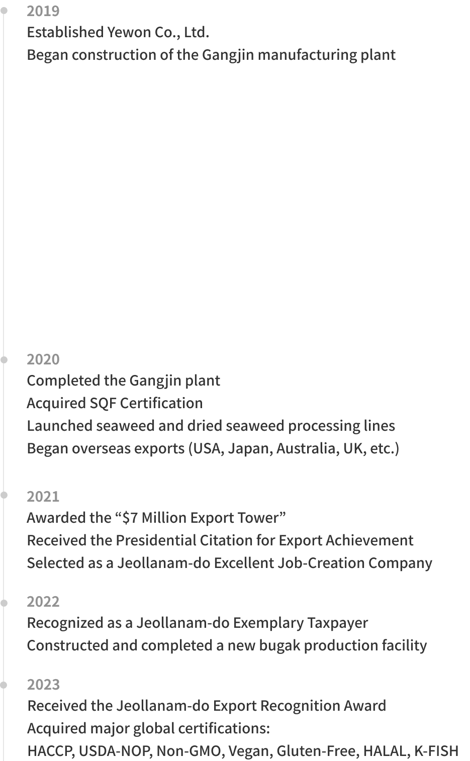 To further strengthen Korea’s seaweed industry and establish deeper expertise in sea vegetable production, Yewon Co., Ltd. was founded as an independent corporation in 2020.